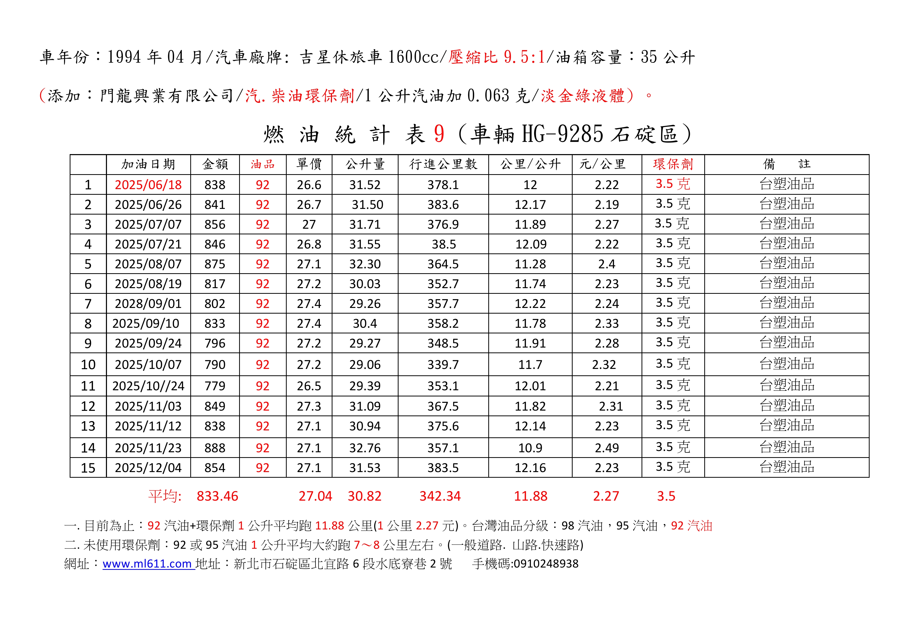 备注: 未使用汽油环保剂:平均1桶53公升95汽油.平均1公升行进哩程数:约8.3公里左右(基数算法: 使用车号3850-B2/2400cc)。